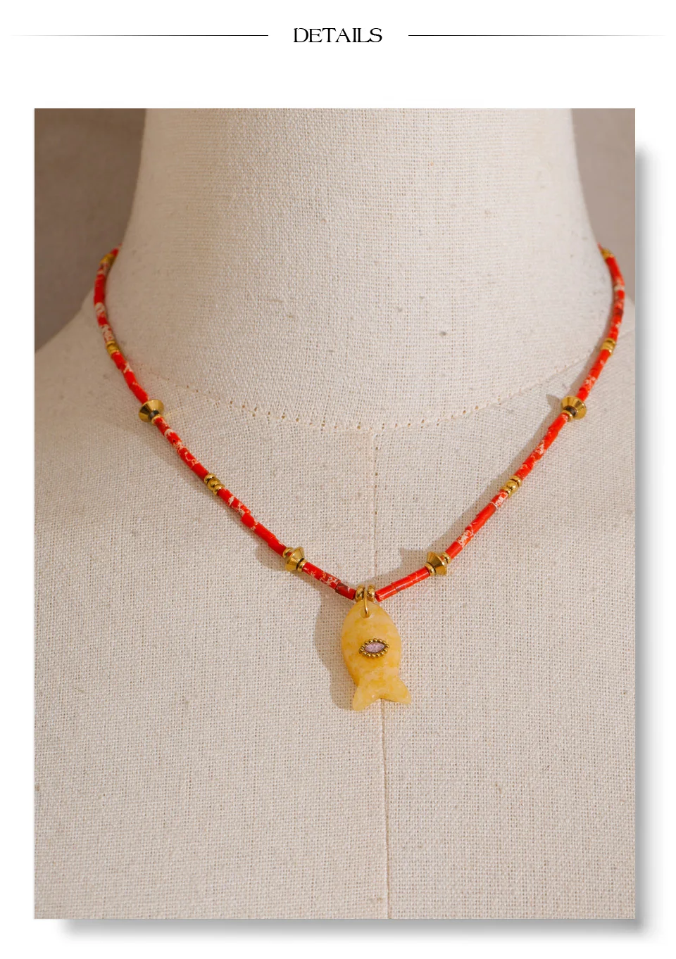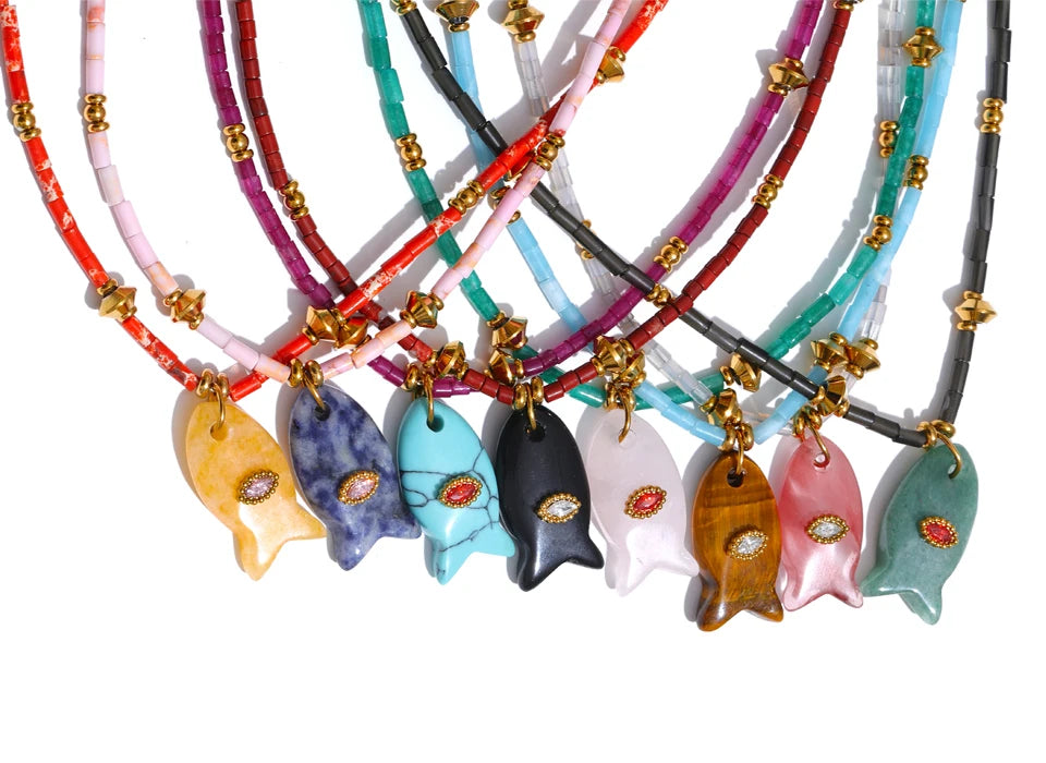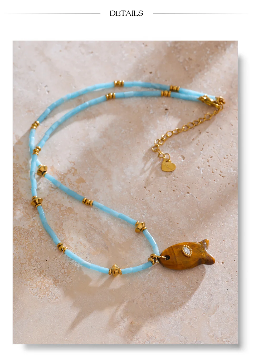 Collar con colgante de pez de piedra tigre turquesa y ágata aventurina natural estilo océano, joyería hecha a mano.