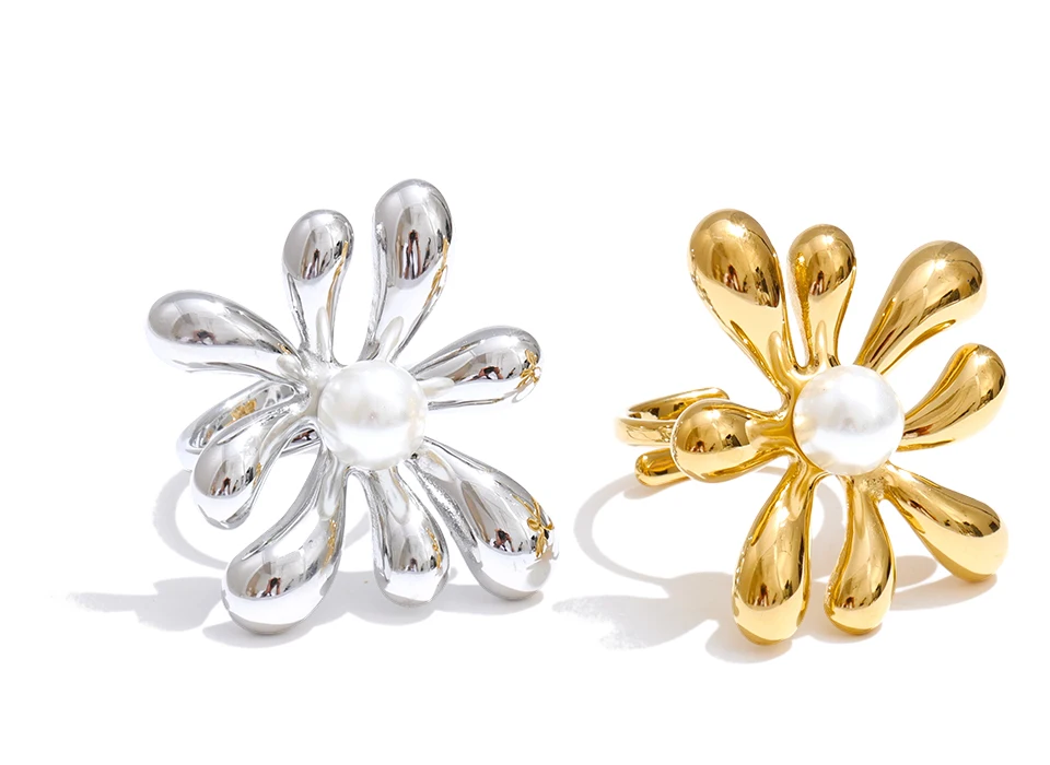 Anillo elegante y único de acero inoxidable con perlas y flores, ajustable, de moda para mujer, resistente al deslustre, minimalista.