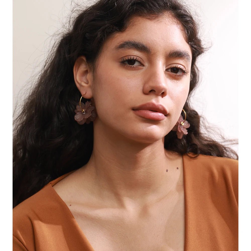 Pendientes colgantes de acero inoxidable, resina acrílica y pétalos de flores en varios colores: verde, amarillo, morado, rojo y blanco. Joyería moderna.
