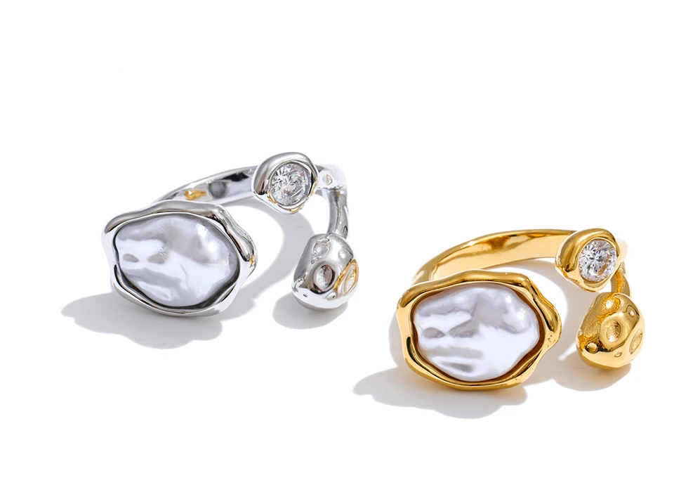 Anillo de acero inoxidable chapado en oro y platino con perlas de imitación y circonitas, talla 8, estilo único, geométrico, estilo retro.