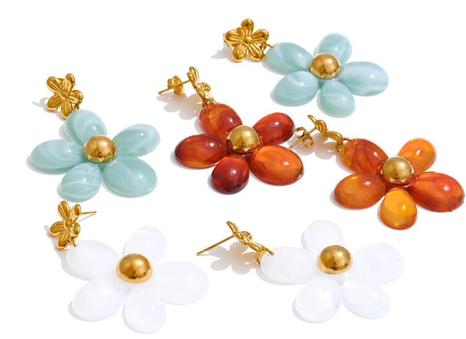 Pendientes colgantes de resina con forma de flor para mujer, de acero inoxidable, color ámbar, blanco y cian.