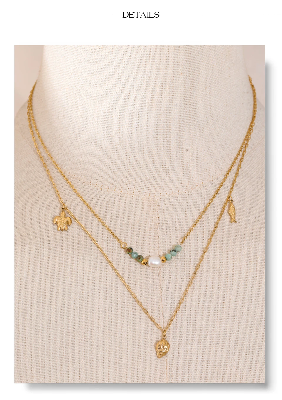 Collar con cadena de doble capa, concha, tortuga, pez, gota, acero inoxidable 316L, piedra natural, perla.