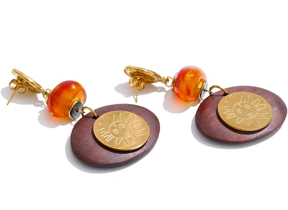 Pendientes colgantes redondos de acero inoxidable, madera, resina, piedra y sol, para prevenir alergias, joyería de moda para otoño e invierno.
