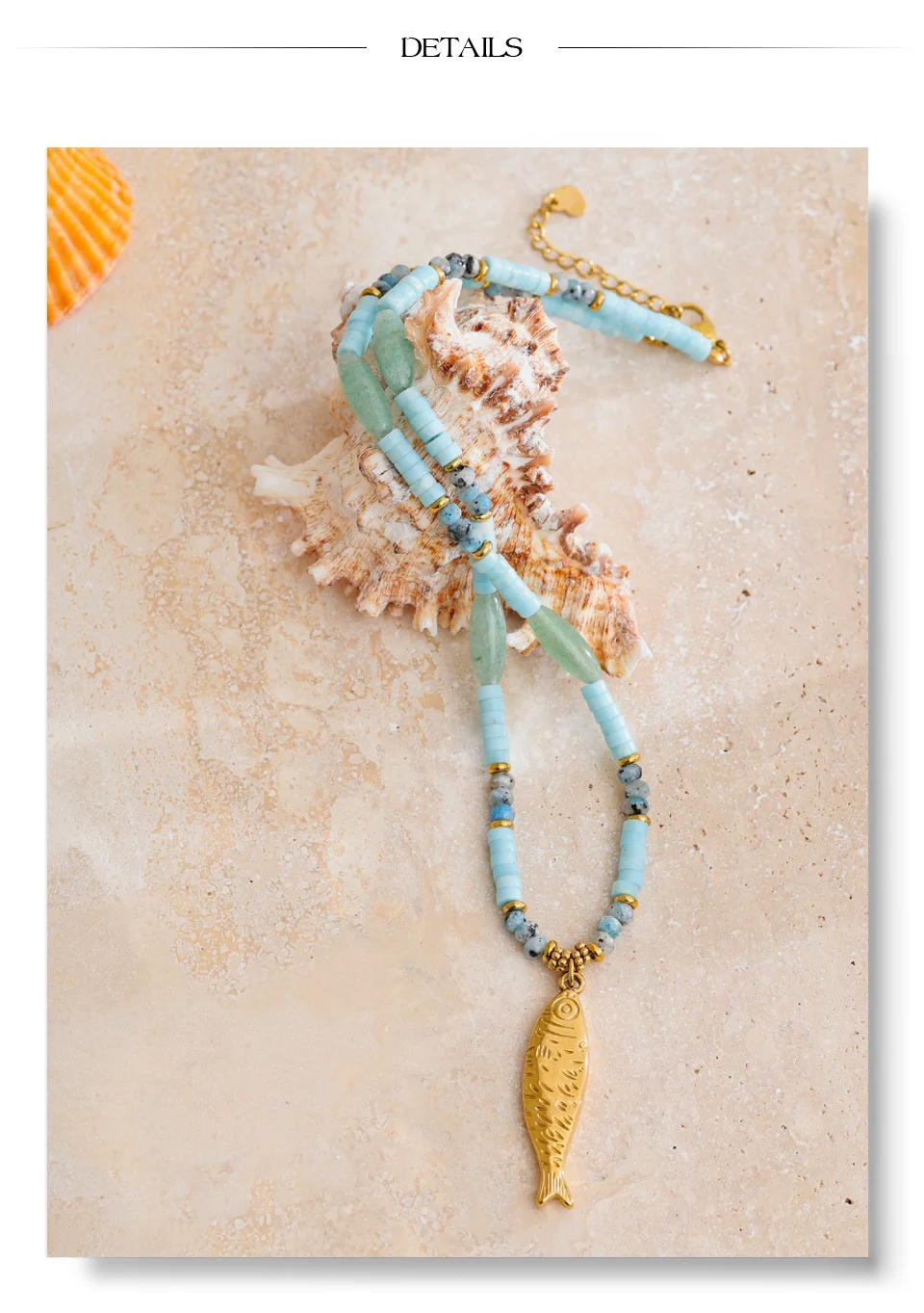 Nuevo collar con colgante de cadena de pez con piedra de aventurina natural, de acero inoxidable, hecho a mano para verano.