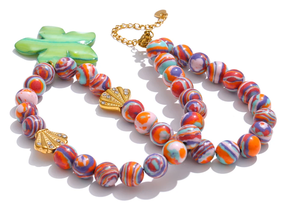 Joyería Hecha a Mano Colorida Cadena de Cuentas de Piedra de Malaquita Sintética Flor de Concha Verde.