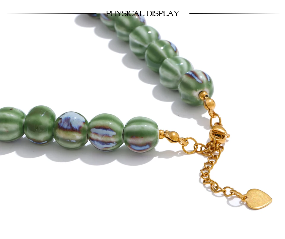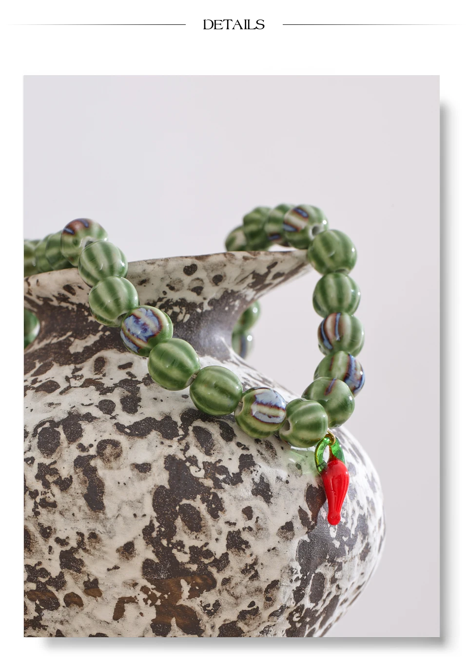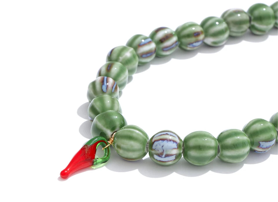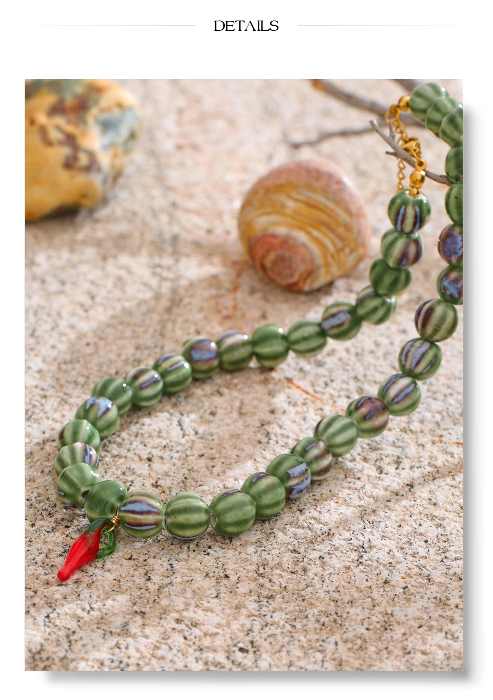 Collar de cuentas de cerámica verde con forma de gota de chile, hecho a mano, elegante, único, resistente al deslustre.