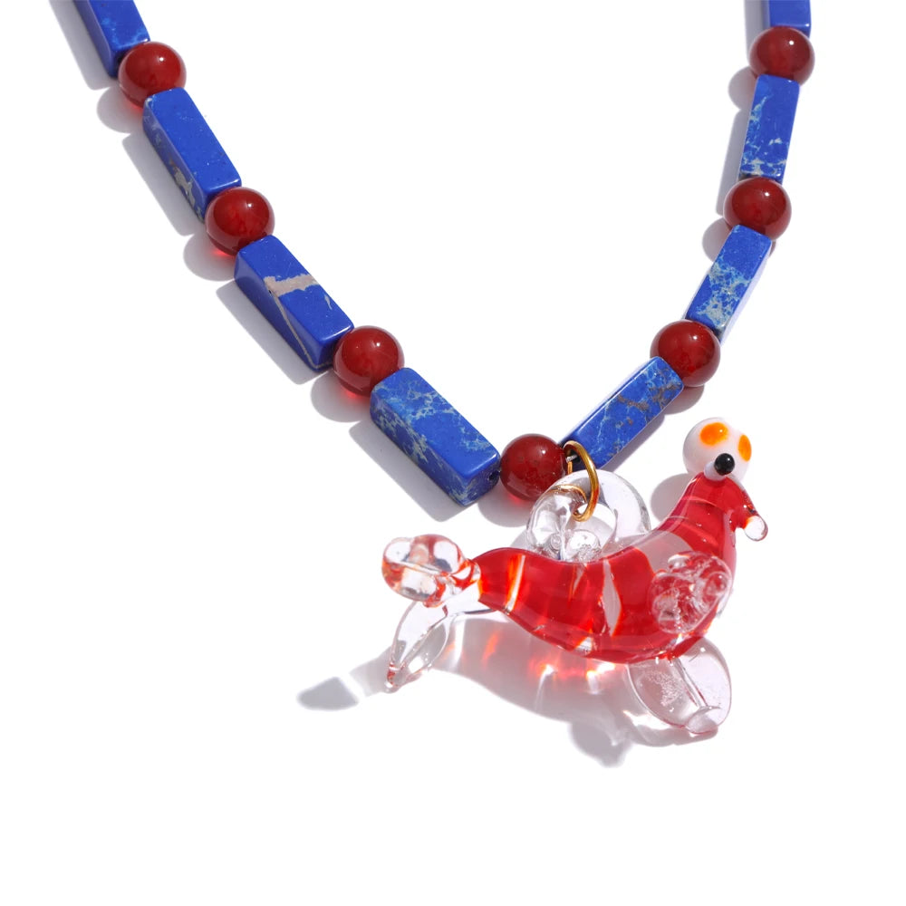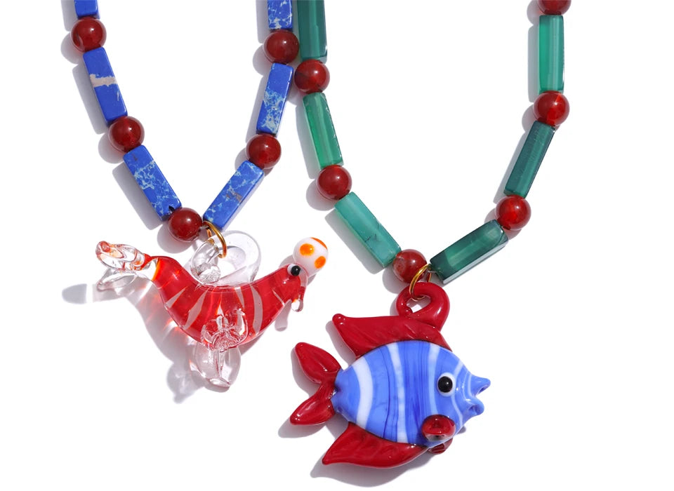 Collar con colgante de pez león marino esmaltado estilo océano, cadena de piedra natural de alta calidad, joyería hecha a mano.
