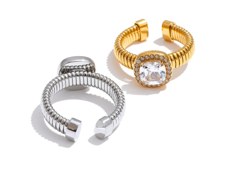 Anillo abierto cuadrado ajustable de acero inoxidable con circonita cúbica, joyería de moda para mujer, chapado en oro PVD de 18 quilates.