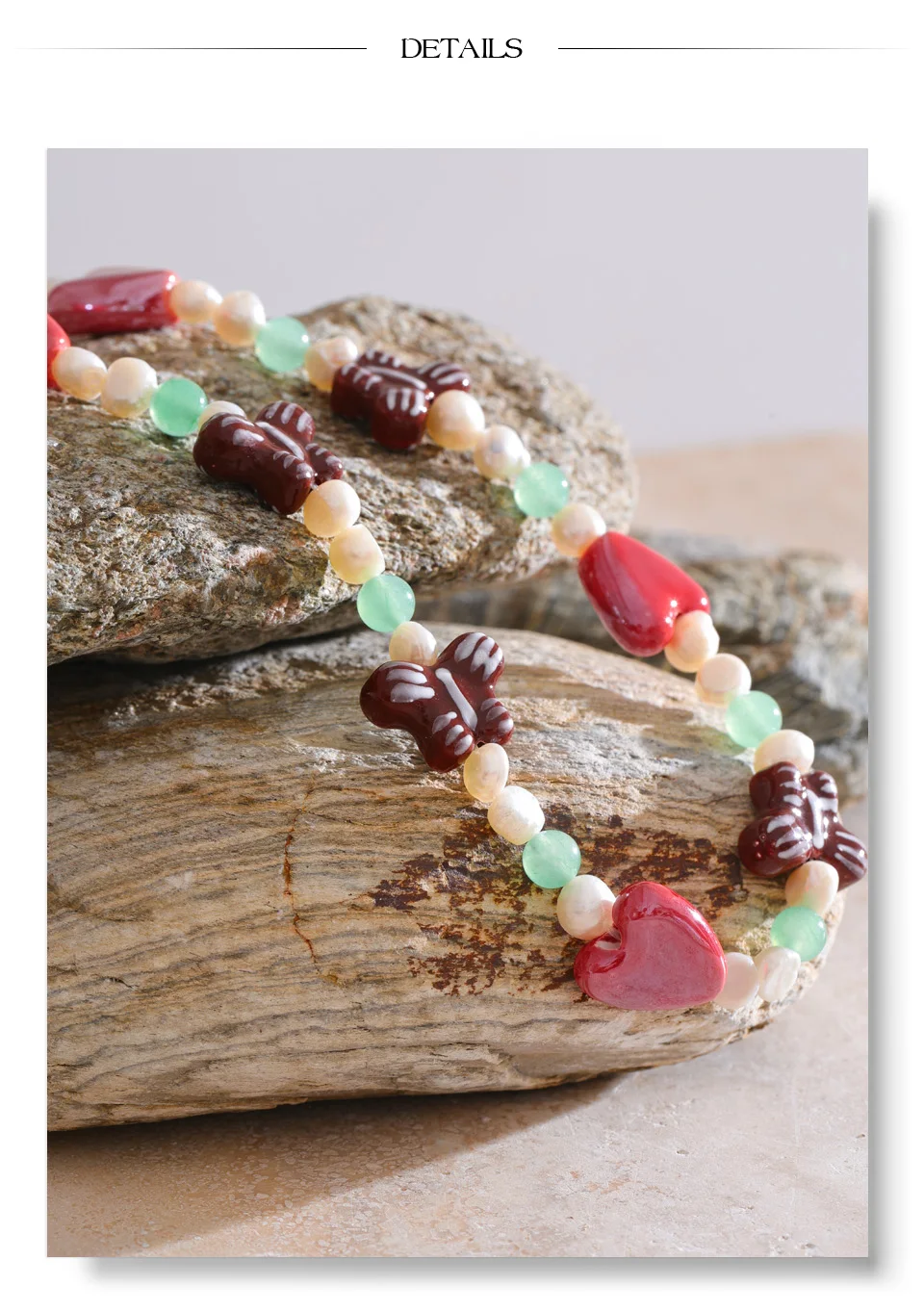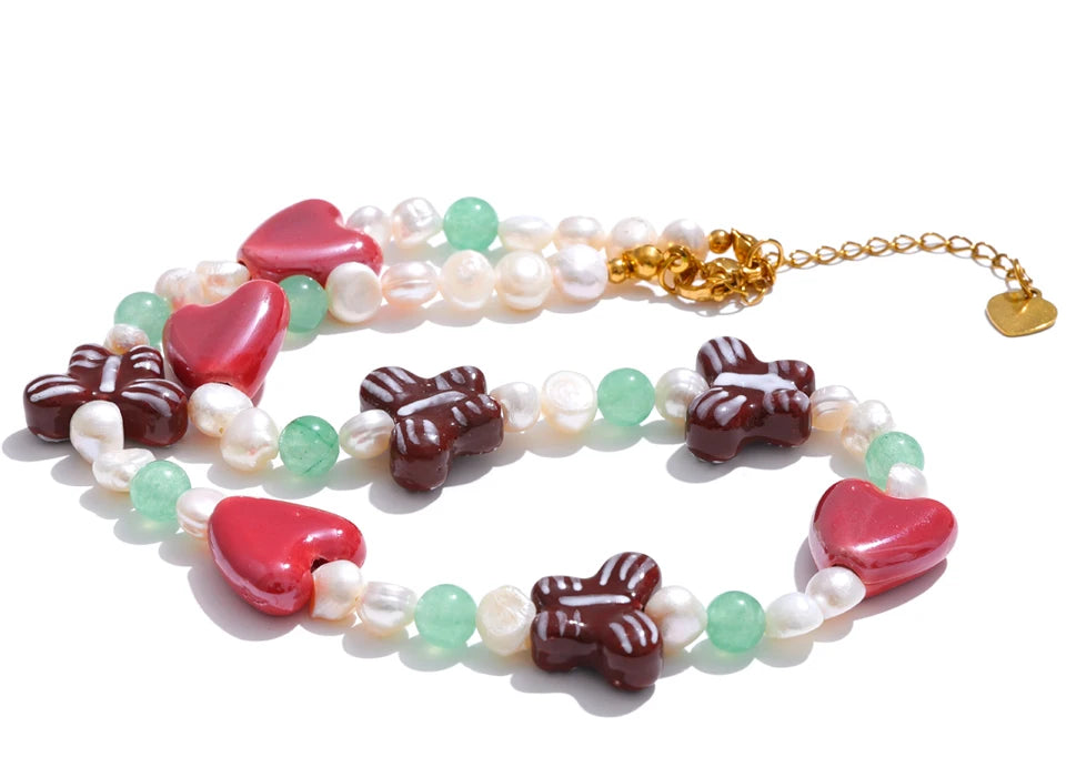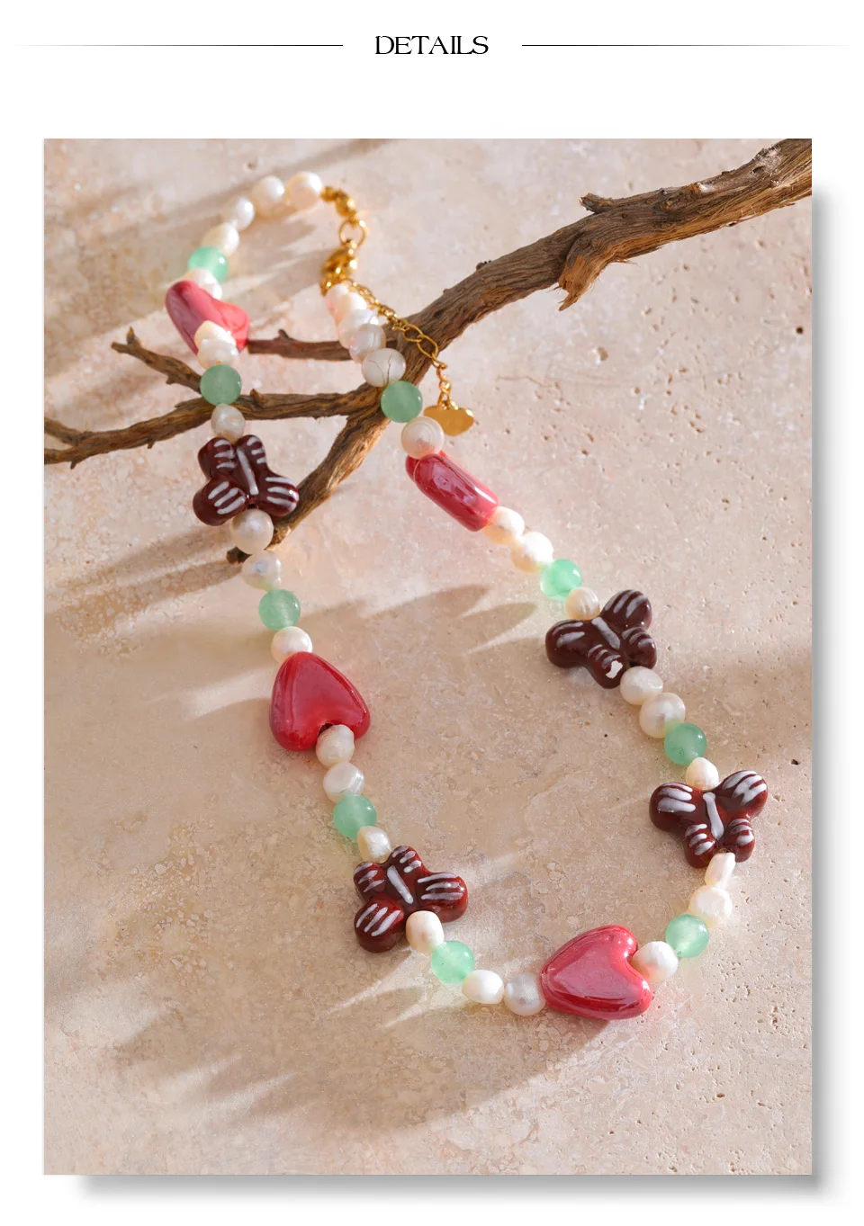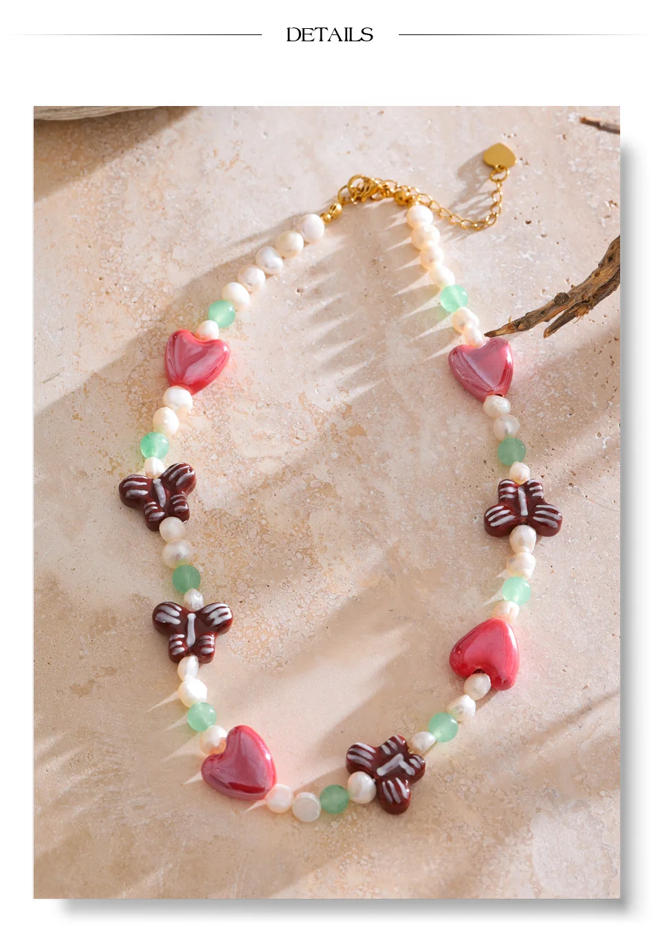 Collar de cadena con forma de corazón de mariposa de cerámica y piedra de perla natural de lujo, exquisita joyería hecha a mano.