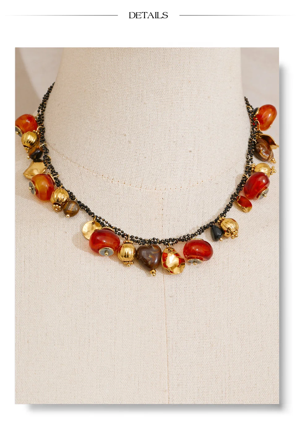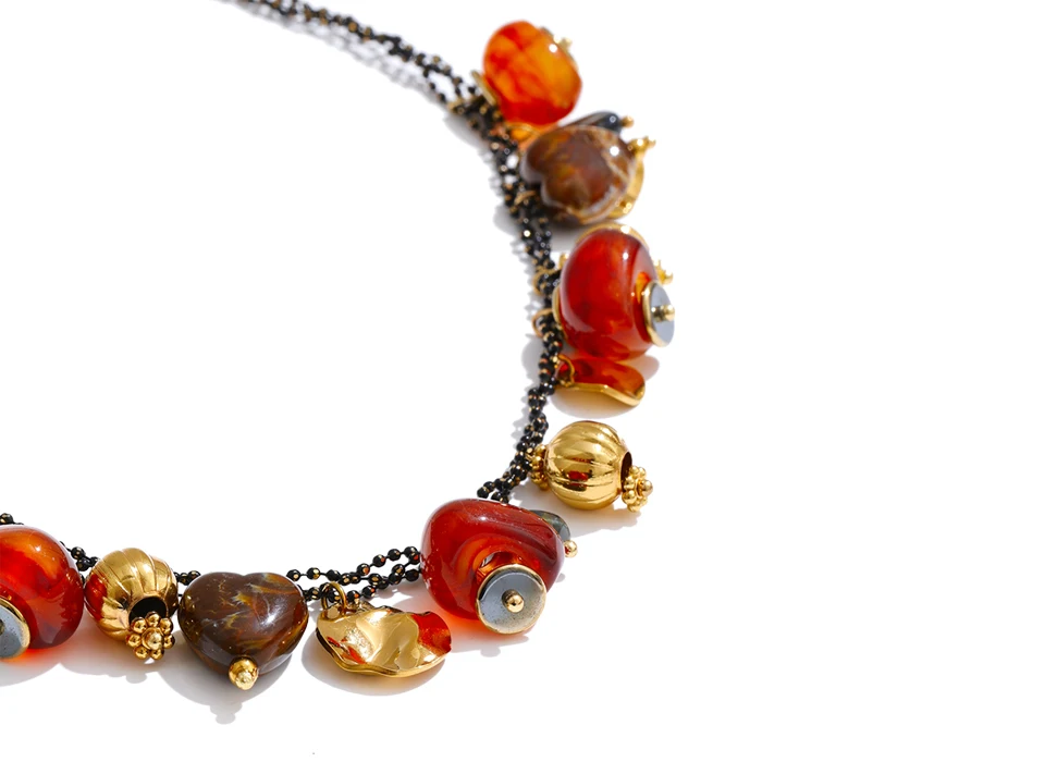 Collar Marbber con cuentas de cadena, dijes de corazón de resina acrílica color ámbar, collar de acero inoxidable, elegante joyería hecha a mano, resistente al agua.
