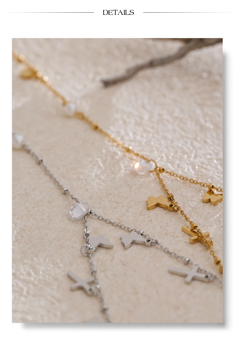 Todas nuestras joyas están fabricadas con acero inoxidable, protegido por un revestimiento de cromo que evita la oxidación y asegura su durabilidad. Las piezas doradas cuentan además con un elegante baño de oro, combinando estilo y resistencia para que luzcan siempre como el primer día.