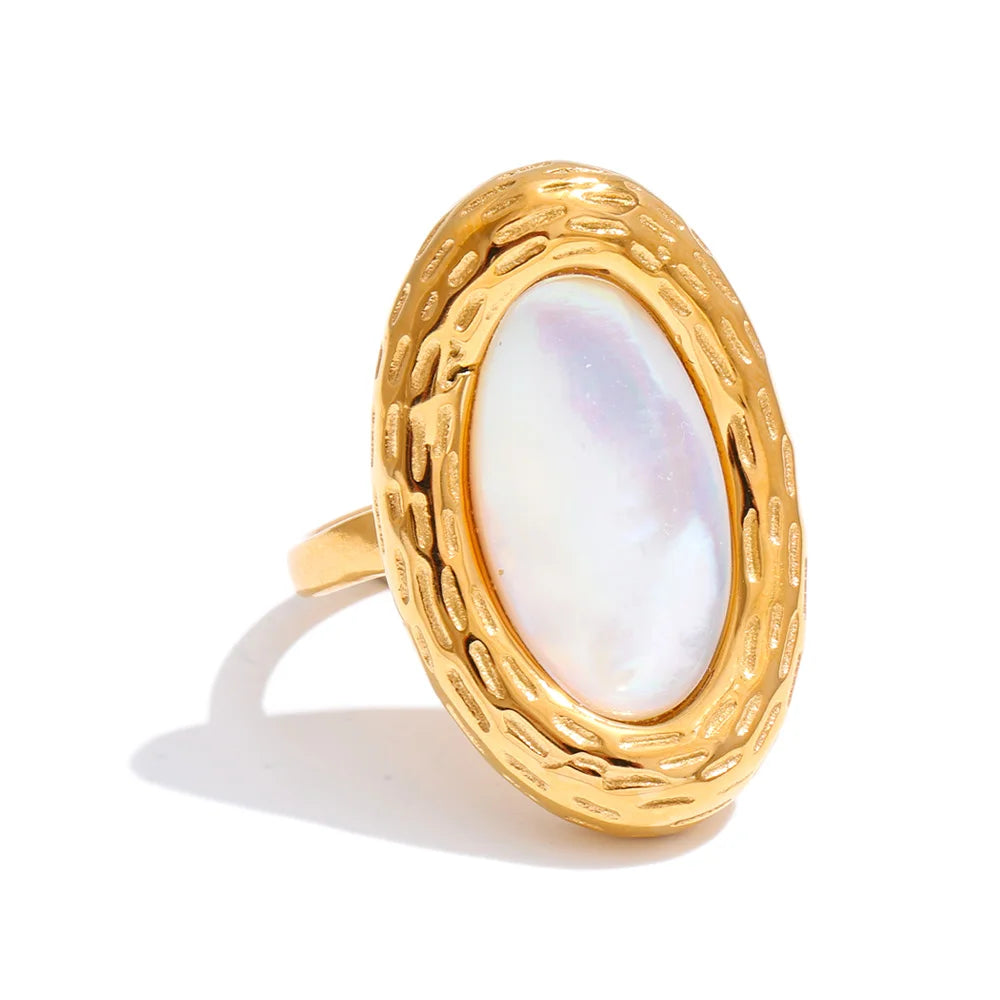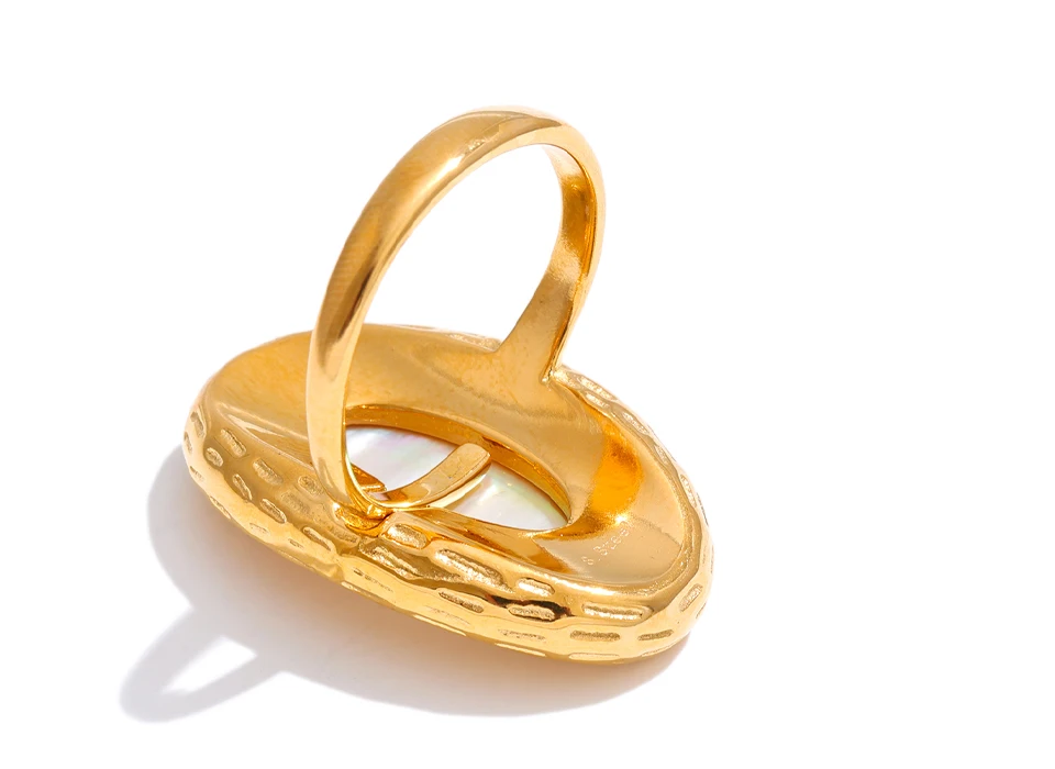 Anillo de acero inoxidable de alta calidad con forma ovalada, chapado en oro de 18 quilates con PVD.