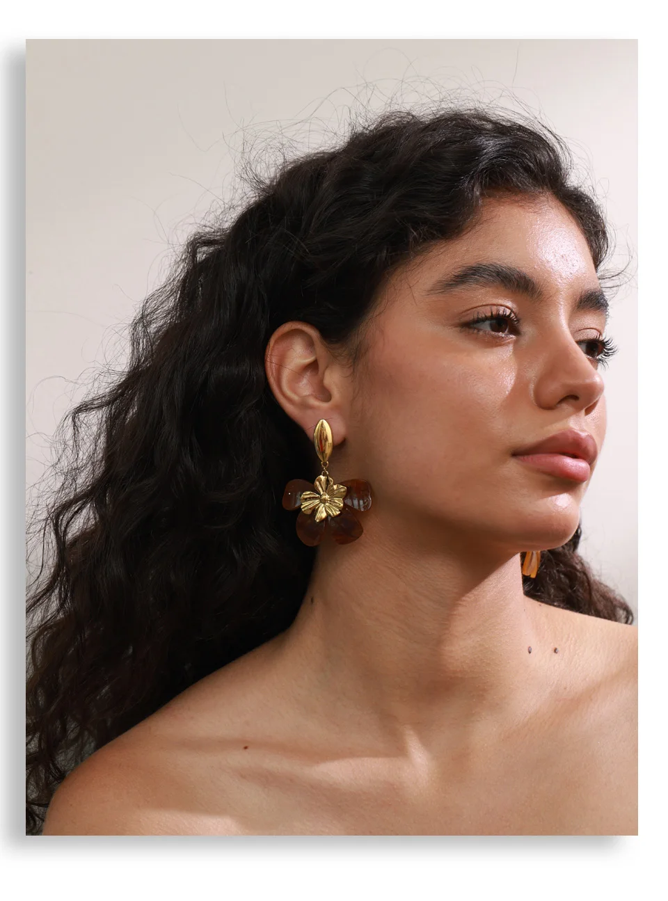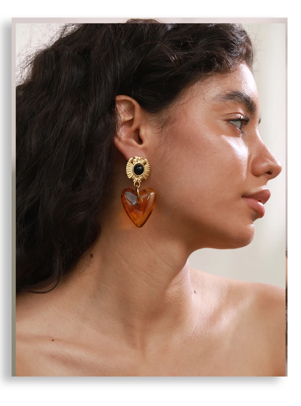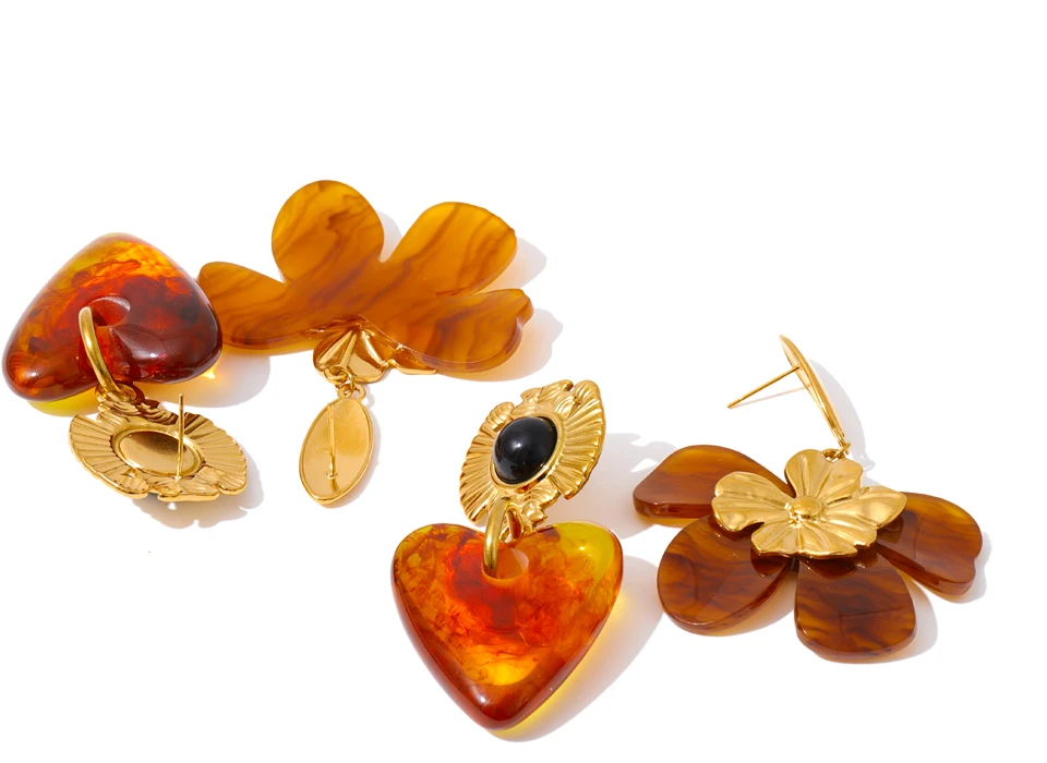 Pendientes colgantes de resina acrílica ámbar con forma de corazón y flor Fashion 2025 para mujer, de acero inoxidable, modernos, con revestimiento PVD dorado y resistentes al agua.